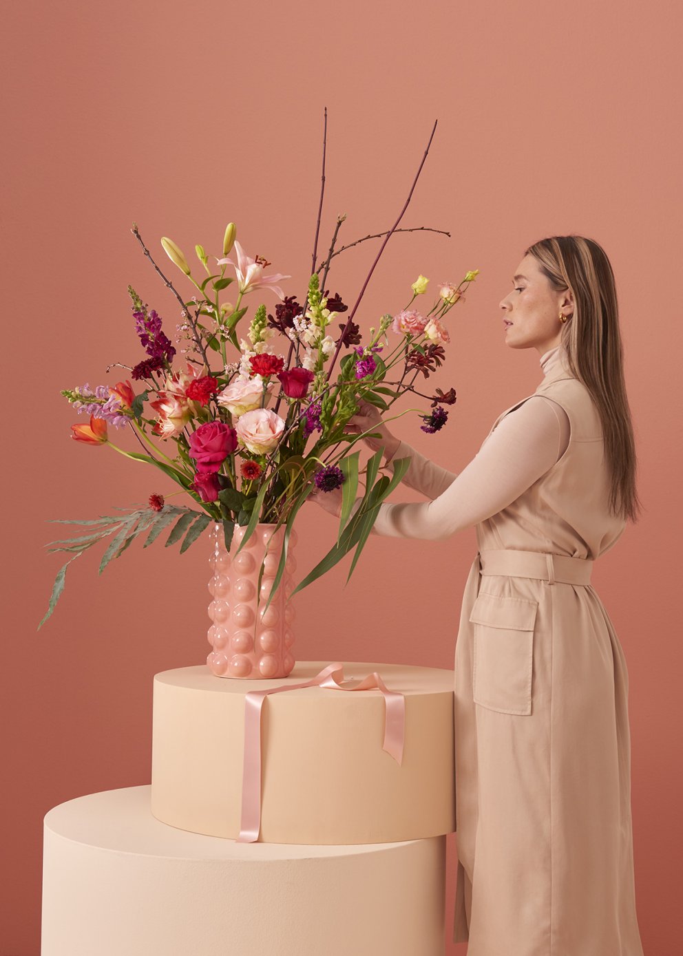 Valentine's day at Bloomon, with soft shapes in sanded plexiglass and wood. I like to keep all in 1 tonal palette inluing the outfits.