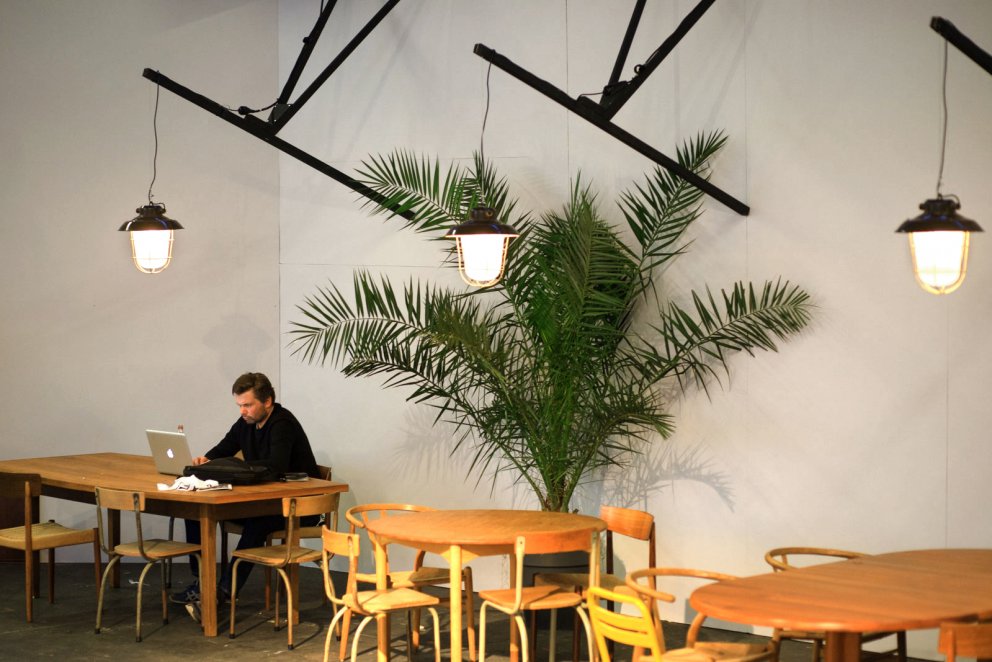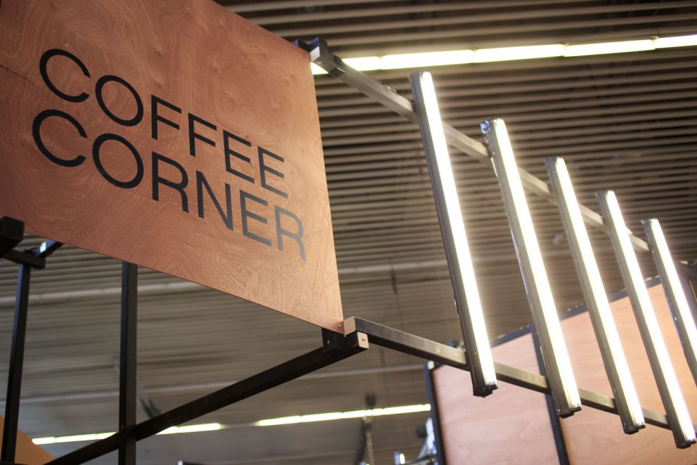 COFFEE CARAMEL styling | interior design Coffee corners and creameries, styled with vintage furniture and caramel colors. On display at Modefabriek Amsterdam, a large fashion event. Collaboration with Christiaan Bakker
