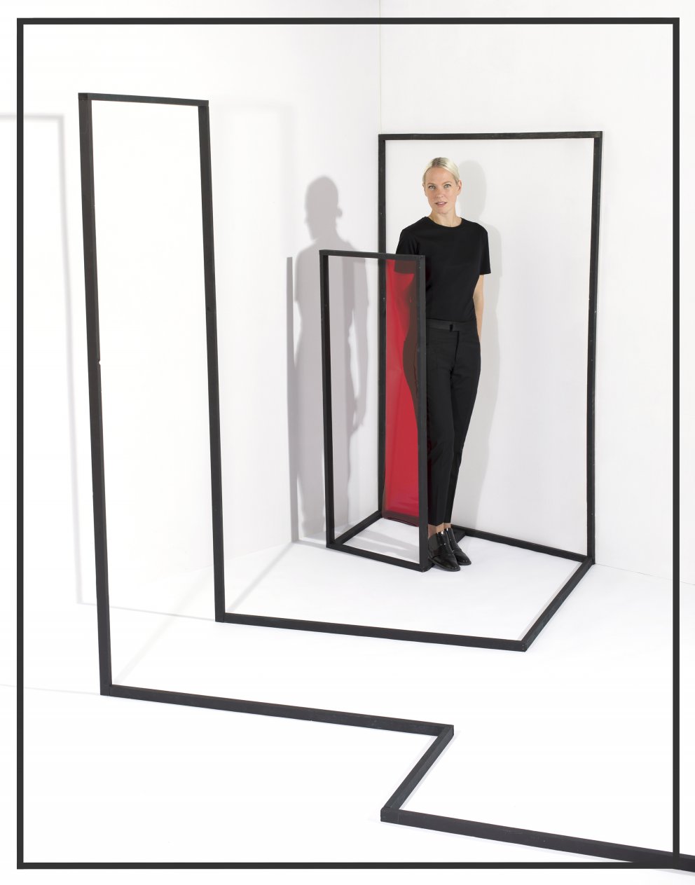 Photoshoot for the design issue of Volkskrant Magazine, portraying 4 leading Dutch design studios and their latest products. The sets are built with black wooden beams and colored cellophane, assembled in interesting optical perspectives, captured from a specific point of view.
