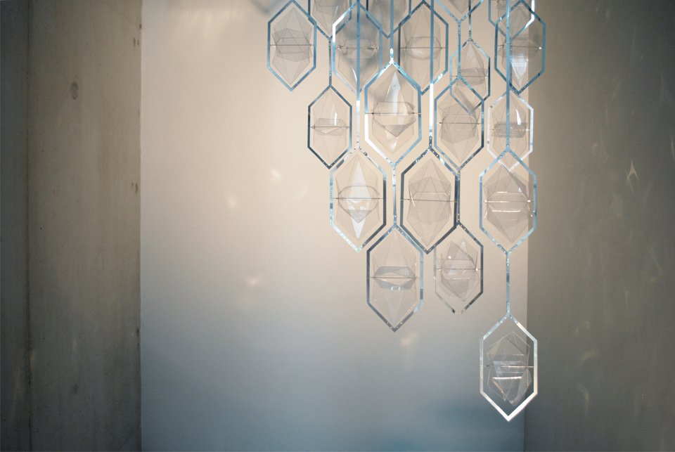 Artwork in the entry hall of a former diamond factory in the heart of amsterdam. The large building is now being used as a creative center for university students. the plexiglass laser-cut shapes rotate by themselves, driven by the airflow turbines that are located begind them in the building. The movement makes them catch the light in different ways, resembling shiny precious diamonds.