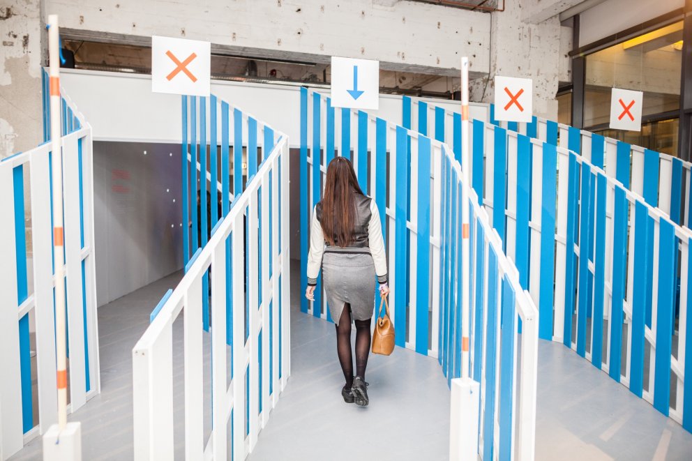 While entering the space, people are led through this colourful landscape and are confronted with making decisions. We then observed how people in a crowd determine which way to go. This project shows that the decision of one person can impact the decision of many and how much the design of a space can affect the behaviour of people in it.