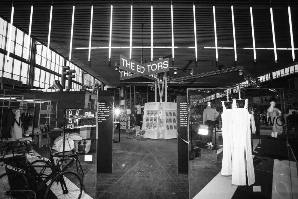 Exhibition design for 'The Editors', a fashion platform that showcases the most interesting upcoming talents in the fashion world, according to 4 different curators. The exhibition consists of mirror displays and graphic lines. The reflections cause an interesting play with reality; the visitors and the products. Also shown is a lecture space, where fashion-forward talks are held. This project was done in collaboration with Christiaan Bakker.