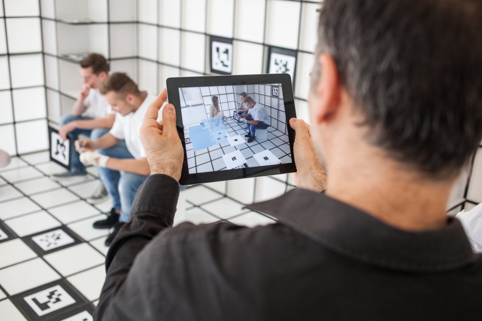 Every 2 weeks out of this 2-month project, the space would change. It started out as a 100% analog room, and transitioned into a 100% virtual room. In the first phase, students were given various tangible materials to work with. In the second phase, QR codes were placed around the room. Through your tablet or phone, the codes would become augmented volumes in the space. In the third phase students were given VR glasses that would filter out everything in the room, except for the color green. In the last phase, they would merely sit in lounge chairs with VR glasses on. Whereby, they would be completely absorbed in a virtual realm.