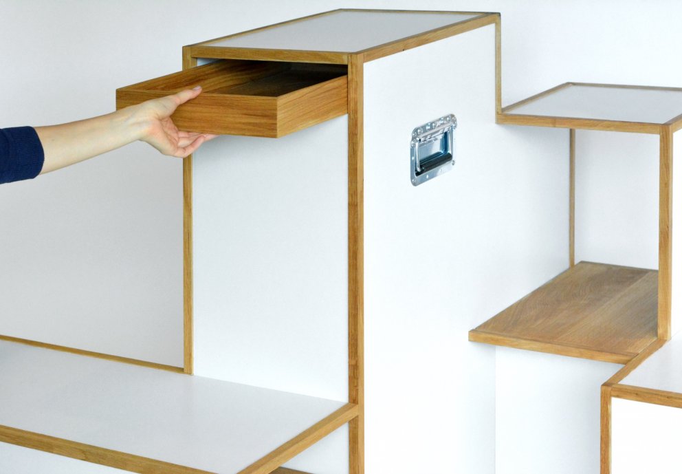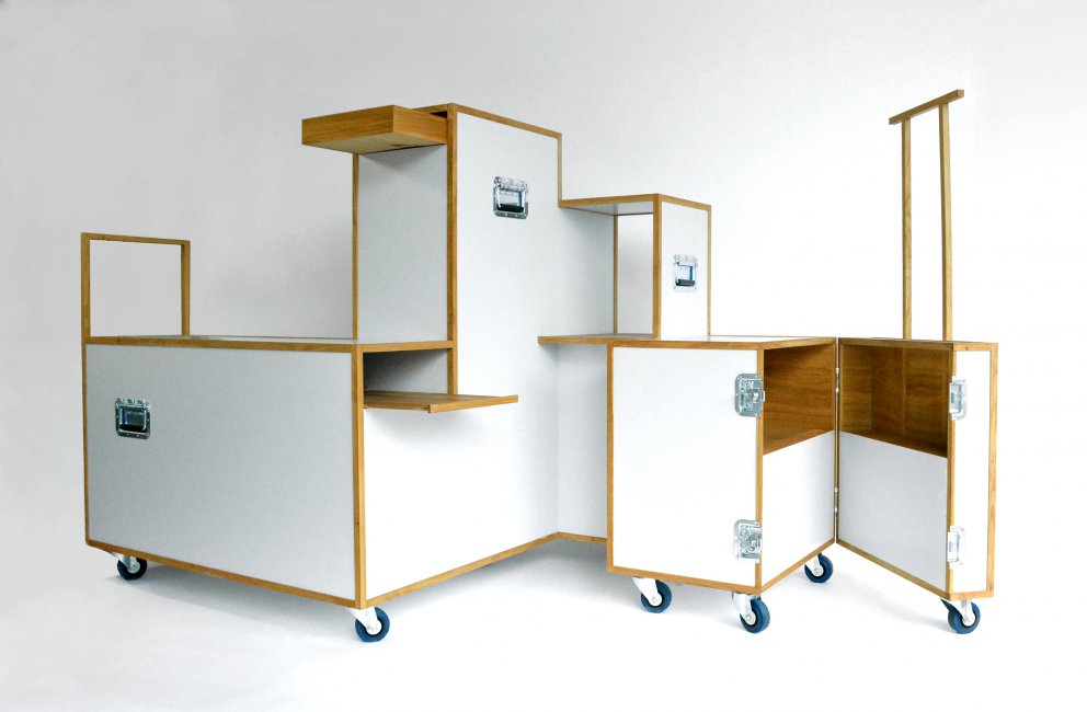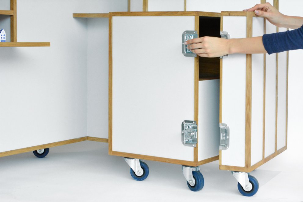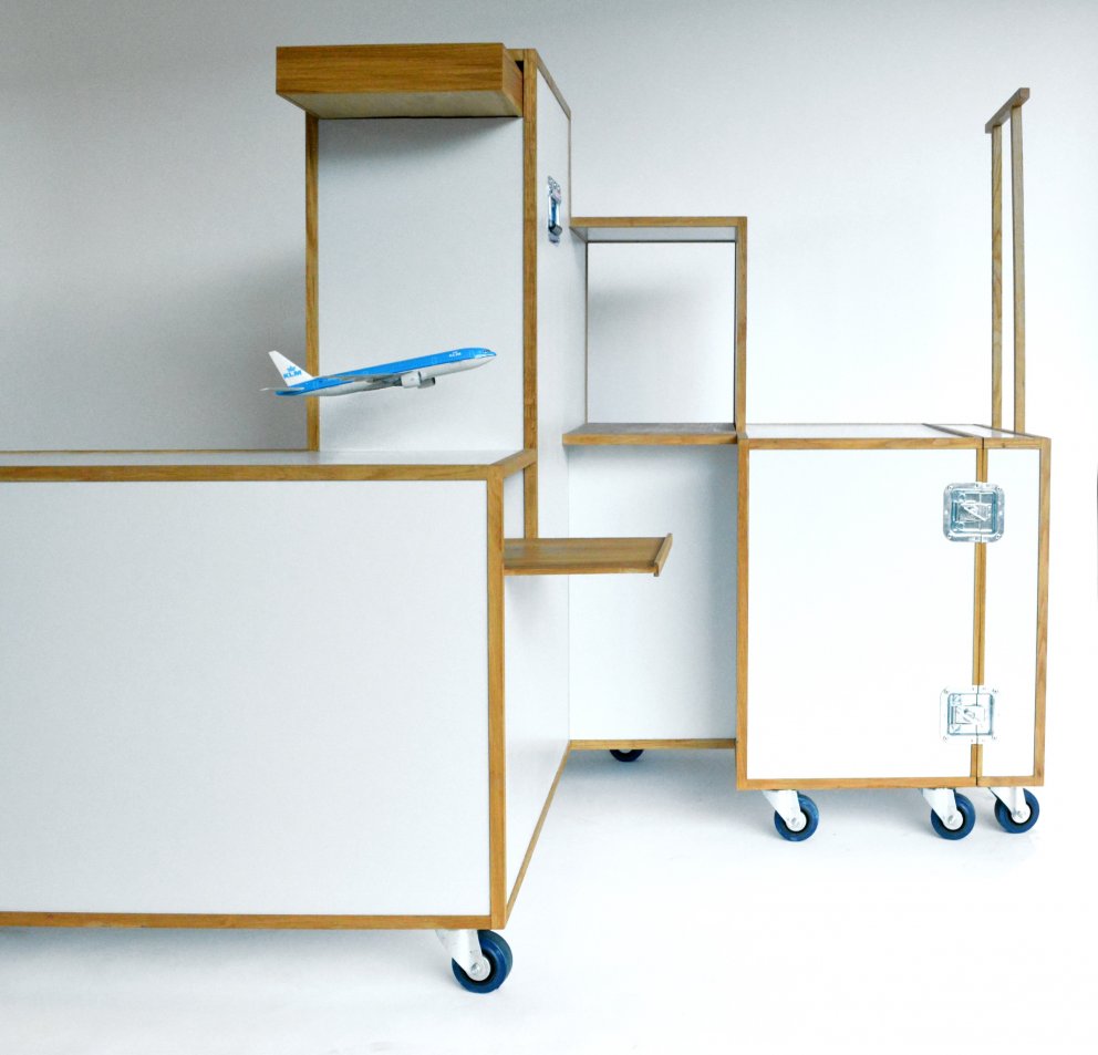 In-flight at home. In collaboration with Chris Bakker, out studio designed the TROLLEYS closet for KLM, borrowing its function and style from the iconic airline aisle trolley. The cluster design was created to match the dynamic lifestyle of the urban nomad, using clever formations to accommodate more than a closet-load of belongings – ringing true to the old adage ‘fit your whole life in a box’. The design is made from poplar and oak wood, and can be customized in size and colour.